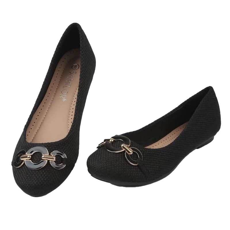 These stylish black ballerina flats are the perfect blend of comfort and style. The sleek, minimalist design is elevated by the delicate chain detail, adding a touch of sophistication. The slip-on style makes them easy to wear, while the cushioned insole ensures all-day comfort.